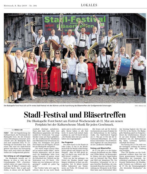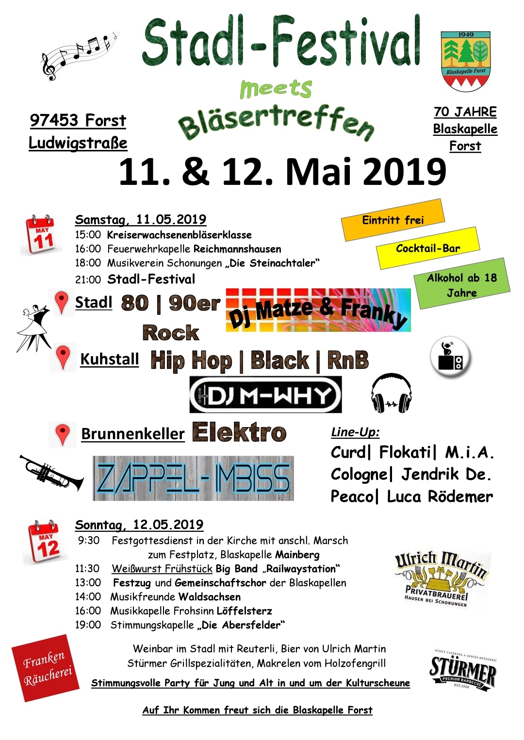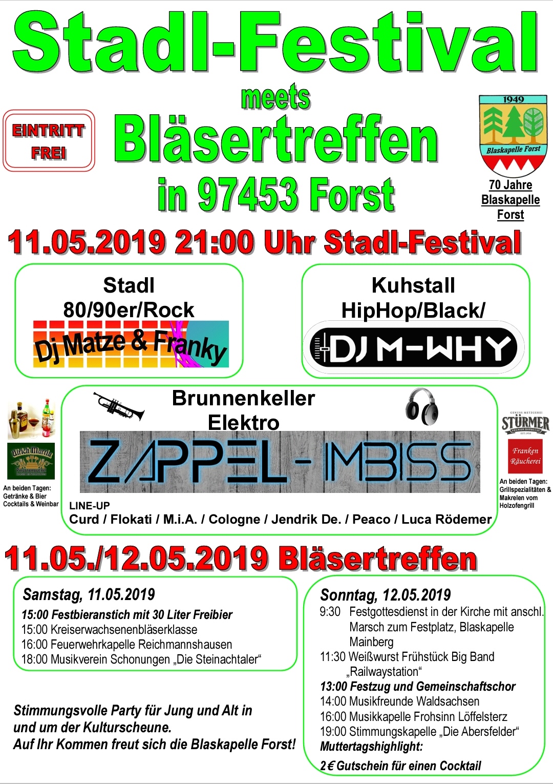 Die Blaskapelle Forst feiert am 11.und 12.05.2019 ihr 70 jähriges Jubiläum. Dazu wird im Rahmen des alljährlichen Bläsertreffens der Großgemeinde Schonungen einladen. Es sollen mit dem Fest alle Bürger aus dem Umkreis angesprochen werden. Hierzu tragen die Blaskapellen mit traditioneller und neuer Blasmusik bei.
